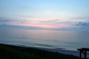 日没前、能野(よきの)ポイントから見た夕日。うねりさえあれば、島の東側にも色々なサーフポイントがあります。